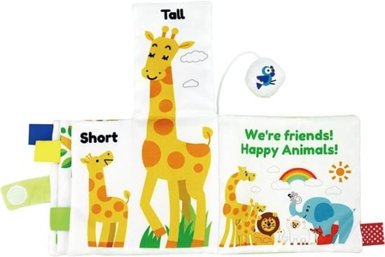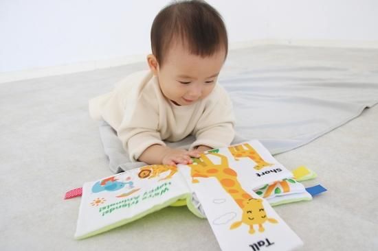 赤ちゃんが大好きな音のしかけとやさしいさわりごこちの布絵本。大きい・小さい、上・下などの違いをかわいい動物イラストと英単語で表現しています。色々なしかけで遊ぶことで、楽しく指先の感覚・器用性を育みます。持ち運びに便利な持ち手つきで、お部屋の中はもちろん外出先でも楽しめます。