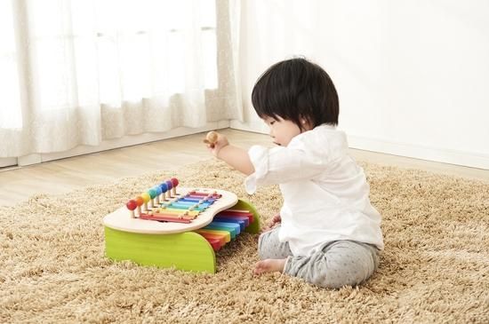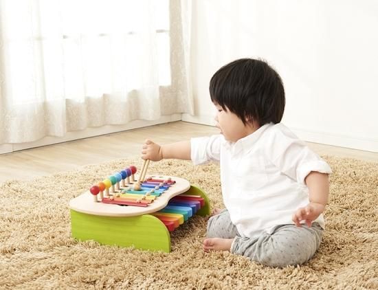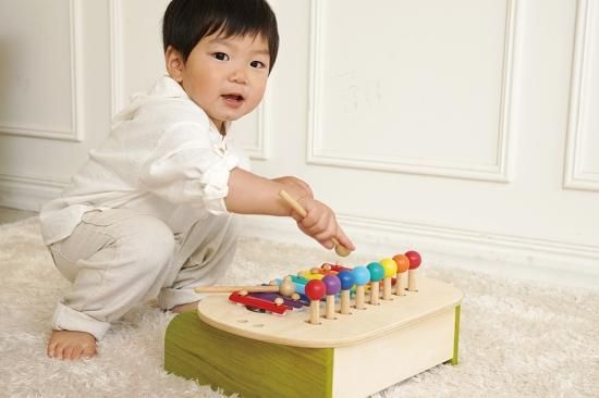 目と耳で楽しめるおもちゃ。天板のシロフォンをスティックで叩いて遊ぶこともできます。